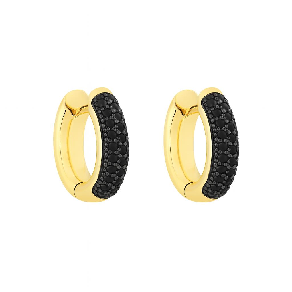 Um brinco de argola click pequeno com pedras de zircônias negras folheado a ouro é uma joia elegante e contemporânea que une sofisticação e praticidade. Características comuns dessa peça incluem: