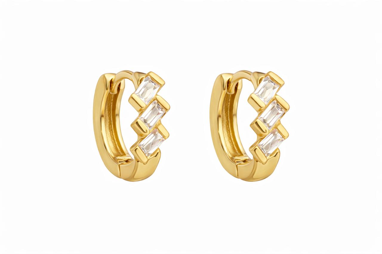 Brinco argola delicado e moderno, confeccionado em metal folheado a ouro, com acabamento polido e fechamento em click, que garante praticidade e segurança no uso diário. A peça é cravejada com 3 zircônias lapidação retangular, alinhadas em formato elegante que proporciona brilho sofisticado e atemporal. Ideal para quem busca um acessório versátil, perfeito para compor produções do dia a dia ou ocasiões especiais.