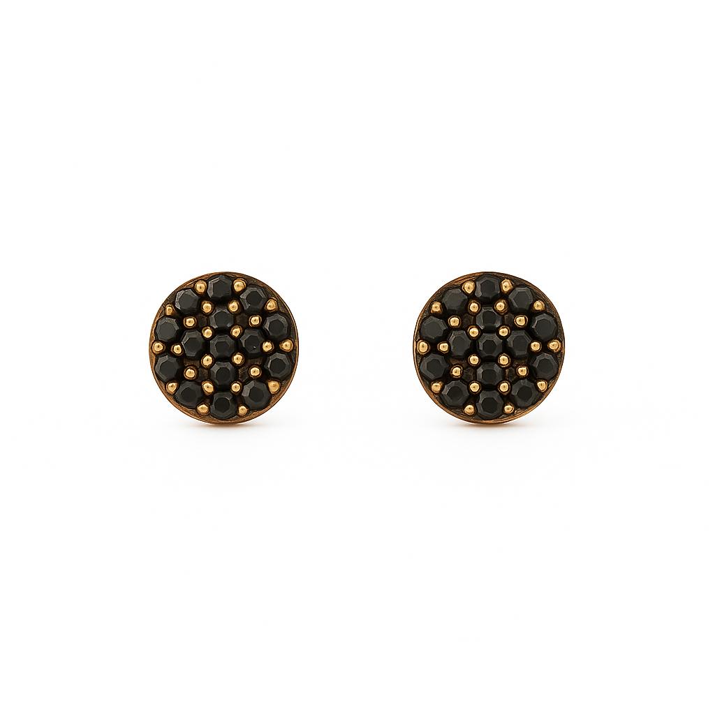 Brinco botão pavê folheado a ouro, cravejado com micro zircônias negras. Elegante, moderno e perfeito para qualquer ocasião.