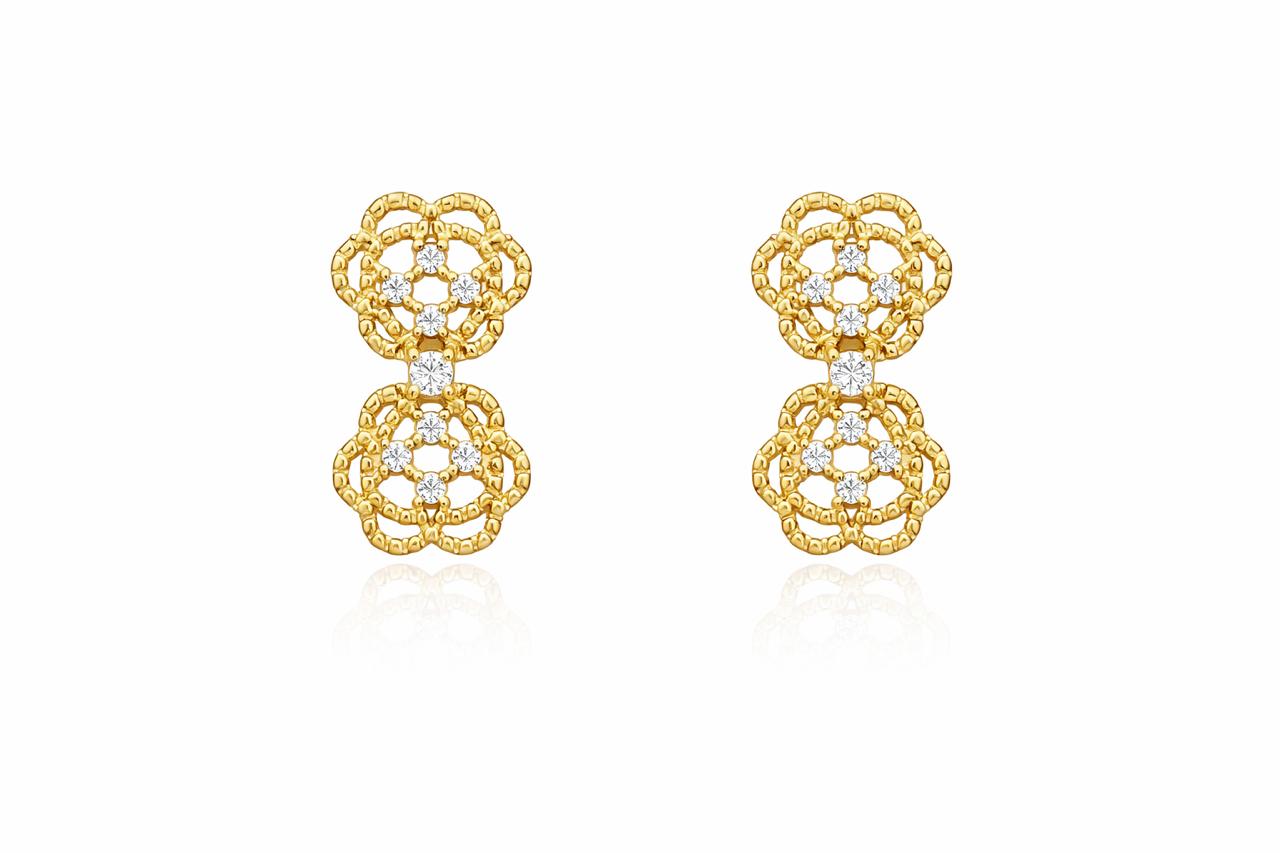 Brinco delicado e sofisticado com design de flores vazadas duplas, ideal para quem busca elegância em cada detalhe. A peça é composta por duas flores interligadas, com acabamento texturizado e zircônias cristal cravejadas, que proporcionam brilho na medida certa.