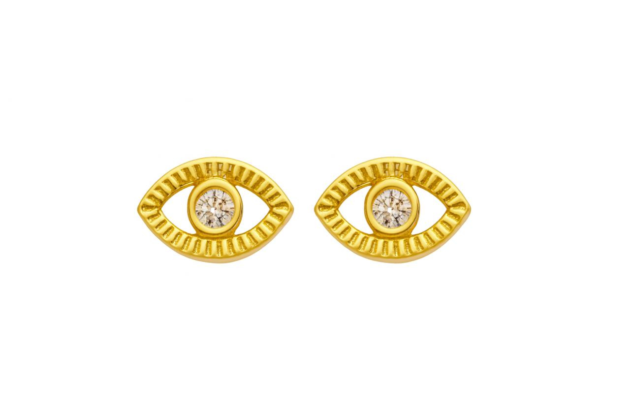Com design em formato de olho, símbolo tradicional de proteção contra energias negativas, o brinco possui acabamento texturizado e uma zircônia cristal central, que traz brilho sutil e sofisticado. Seu tamanho discreto o torna perfeito para o uso diário ou para compor mix de brincos.