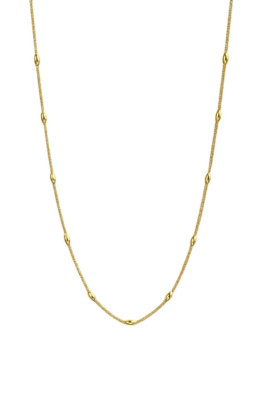 Colar em metal no tom prateado folheado a rôdio branco ou no tom dourado folheado a ouro com design delicado e minimalista. Possui pequenos detalhes esféricos distribuídos ao longo da corrente fina, conferindo elegância e sofisticação. Ideal para compor looks discretos ou para combinar com outras peças em camadas.