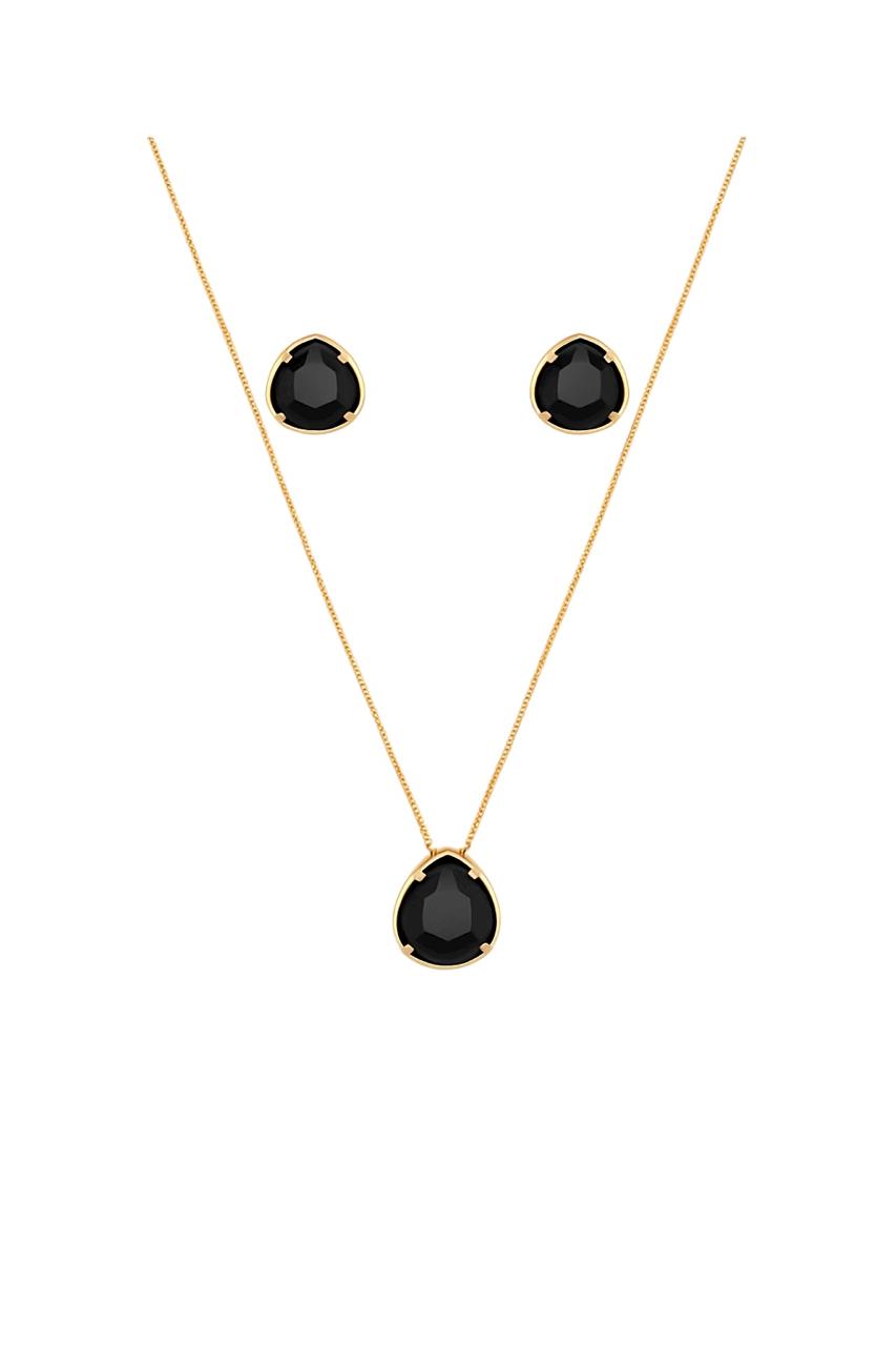 Design: Conjunto gota pedra natural turmalina negra folheado a ouro 18K