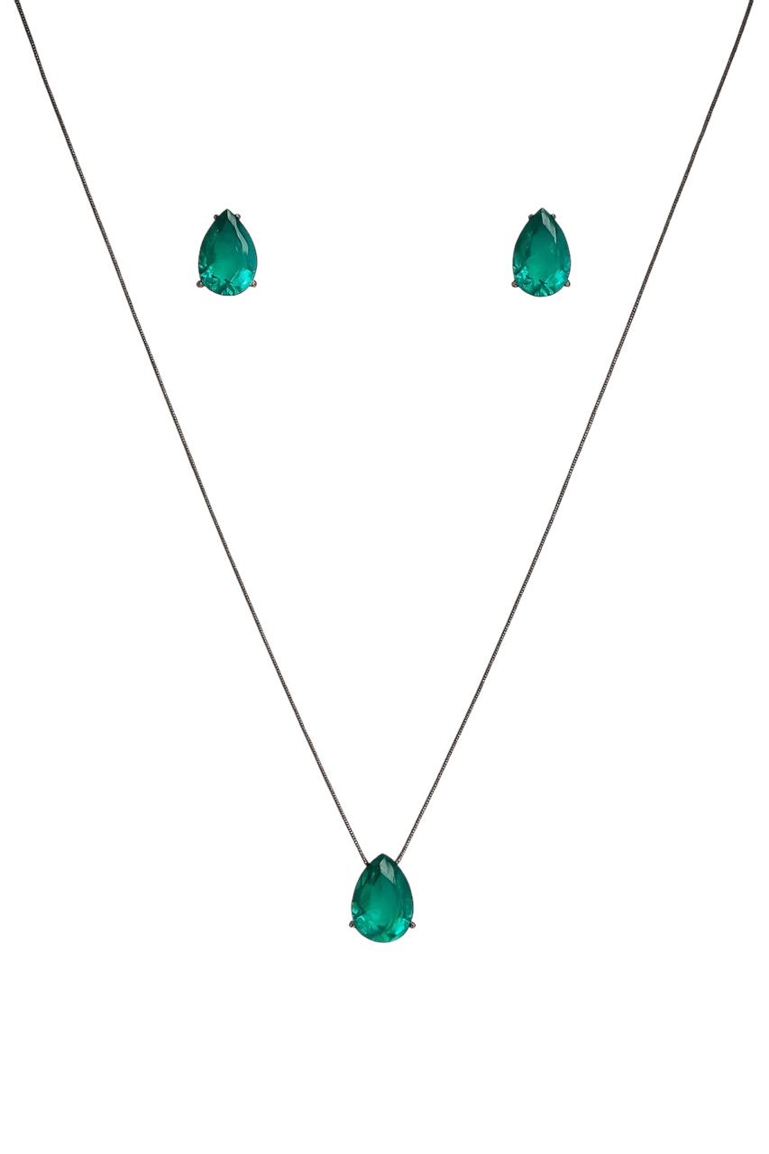 CONJUNTO GOTA ZIRCÔNIA VERDE ESMERALDA FOLHEADO A RÔDIO NEGRO