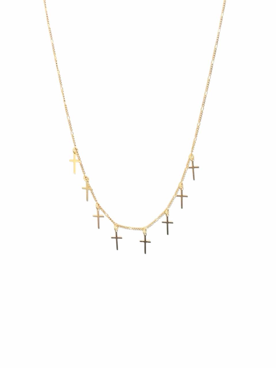 Choker elegante e moderna, composta por delicados pingentes em formato de cruz, folheada a ouro de alta qualidade. Ideal para adicionar um toque de estilo e sofisticação a qualquer look, seja casual ou sofisticado. Um acessório perfeito para quem busca expressar personalidade e fé com charme.