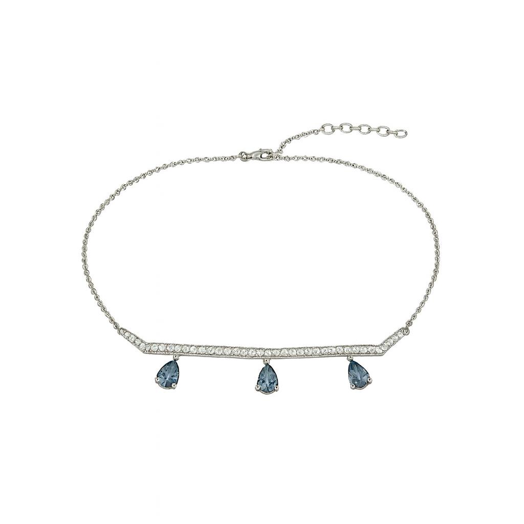 Design: Gargantilha choker com zircônias em cristal e pingentes em gota azul claro folheado a rôdio branco