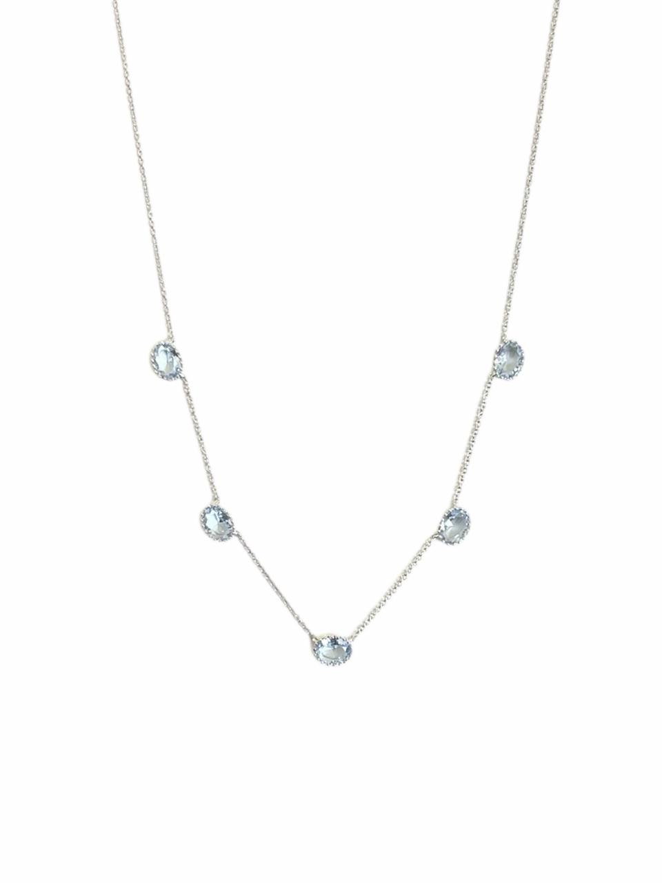 Uma peça sofisticada e minimalista, esta gargantilha é composta por uma corrente fina de prata, adornada com cinco pedras ovais de tom azul-claro, que adicionam brilho e elegância ao design. Perfeita para complementar tanto looks casuais quanto formais, trazendo um toque de leveza e sofisticação.