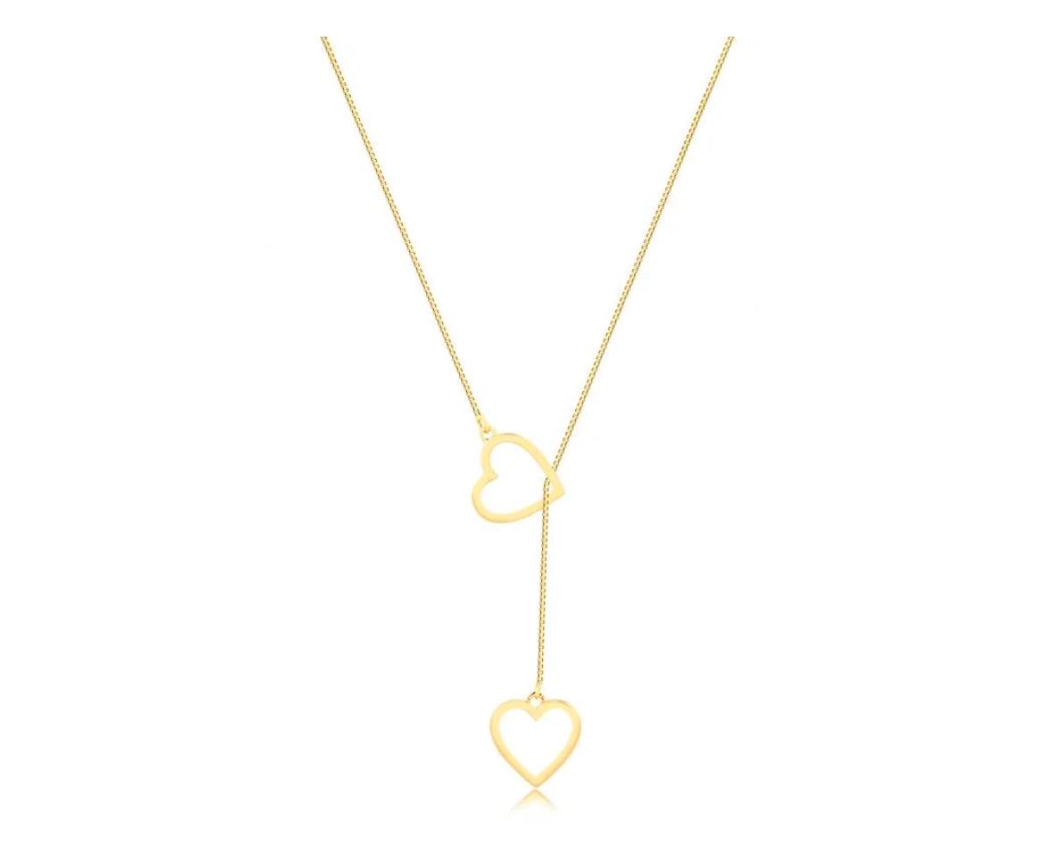 A Gargantilha Estilo Gravata Dois Corações, Vazado e Maciço Folheada a Ouro é uma peça delicada e romântica, ideal para destacar o colo com um design sofisticado e simbólico.