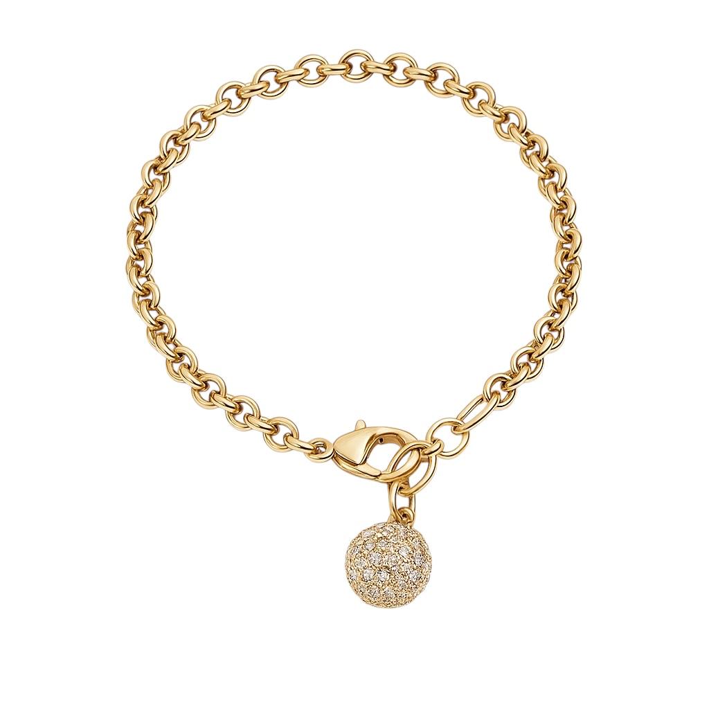 Design: Pulsseira com corrente de elos e pingente de esfera cravejado de zircônia folheado a ouro 18K